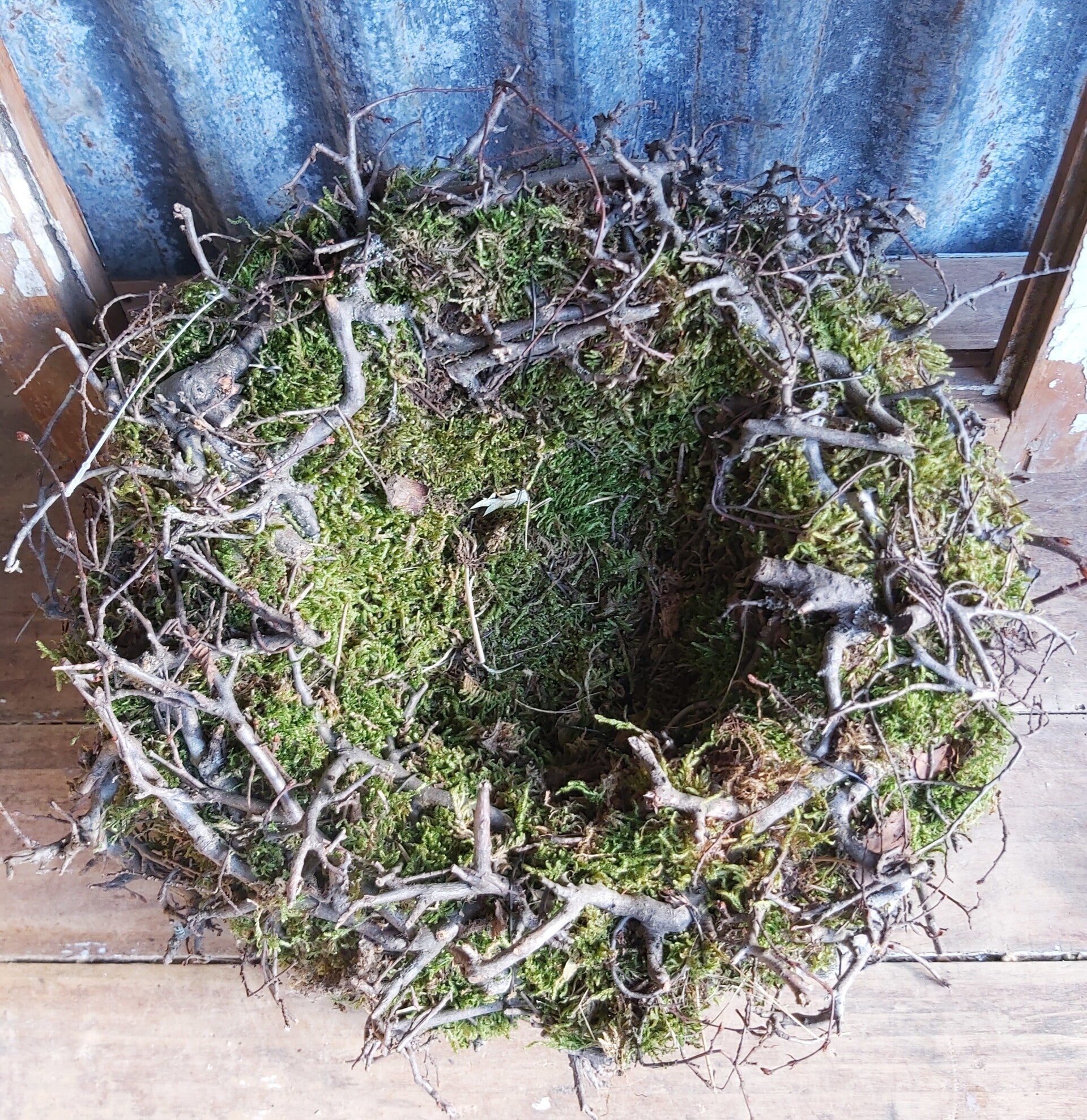 Leuk om bv eitjes in te doen,deze dichte 'Nestkrans' van mos met bonsai takjes.