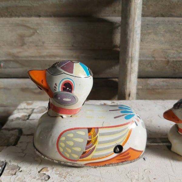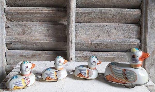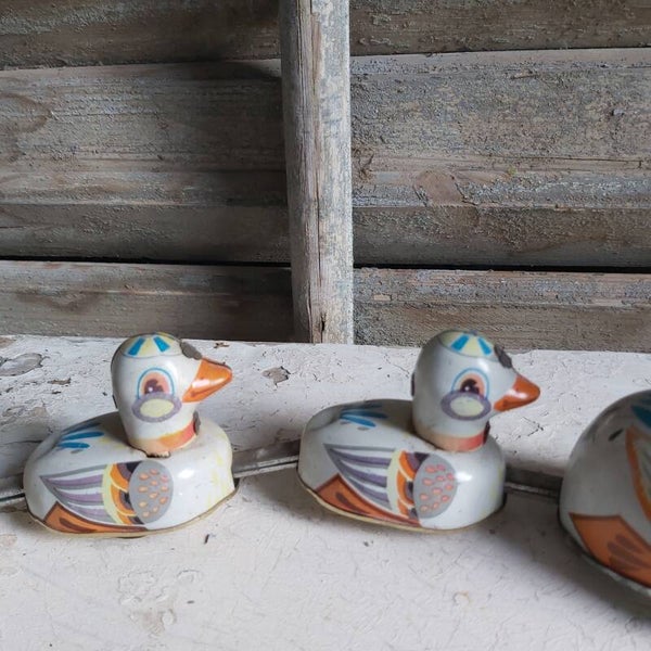 Afm. in totaal 29 cm lang. Het grootste eendje is 8,5 x 5 x 8h
