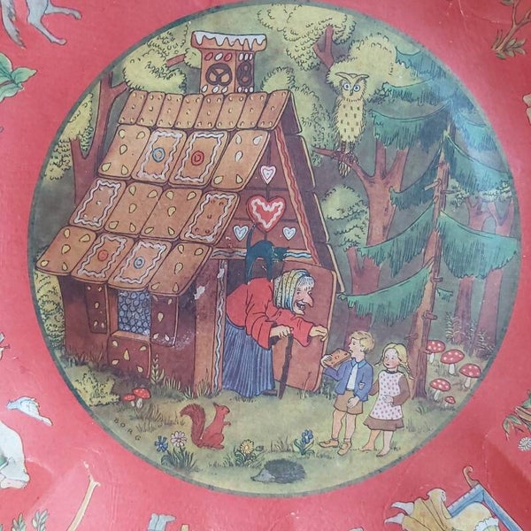 Oud kerstbord van karton waar snoepjes op geserveerd werden.